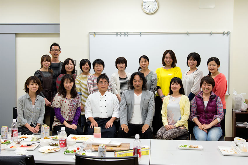 千葉県八千代、道の駅:スマイルデイズにて、料理写真教室。食関係者ばかりなので気合いが入っている面々で最後に普通過ぎる記念写真を撮る。となりは斉藤シェフ。