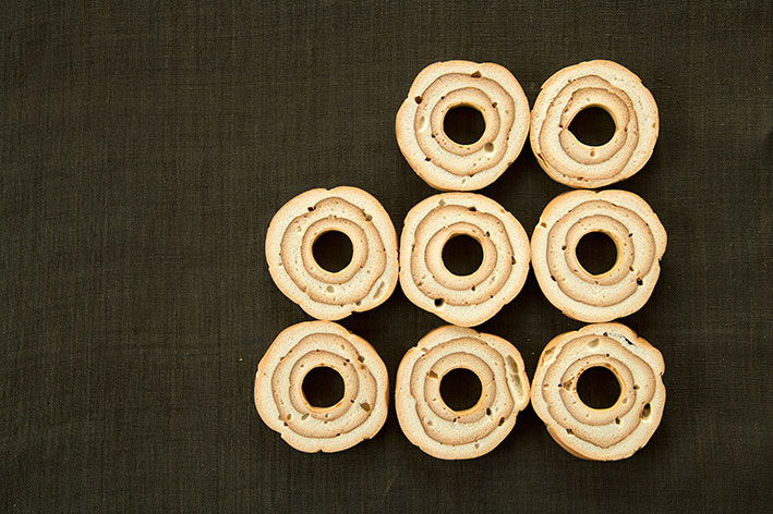 車麩(くるまふ)などの乾物を芸術的に置いて俯瞰で撮ると、色は地味だがとても素直な形になる。