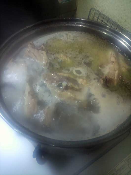 手に入れたガラを使ってスープを取っています。そして更にベジブロスを足すと臭みが消えて旨味倍増なのです。慌てて撮ったから曇ったw