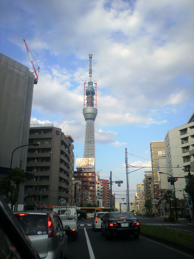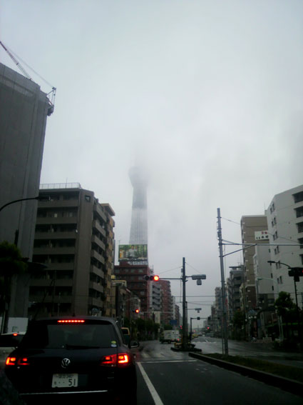 なんと前に、書いたスカイツリーの見える交差点で再び停まったので撮ってみる。天気が悪いとこんな感じで雲の中なんだね!